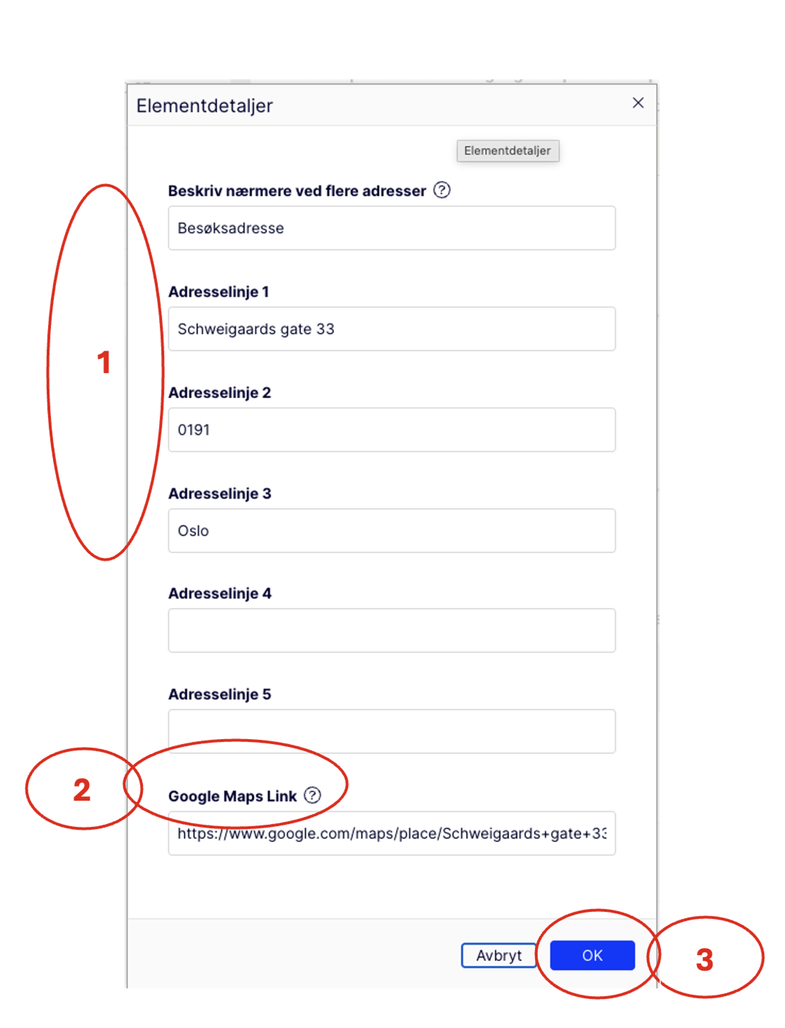 Når du skal legge til en gateadresse, fyller du inn som du ser i bildet (1). Deretter går du til Google Maps og søker opp adressen. Når du har funnet adressen der, limer du inn hele url’en i feltet «Google Maps Link» (2) og til slutt klikker du på «OK» (3)