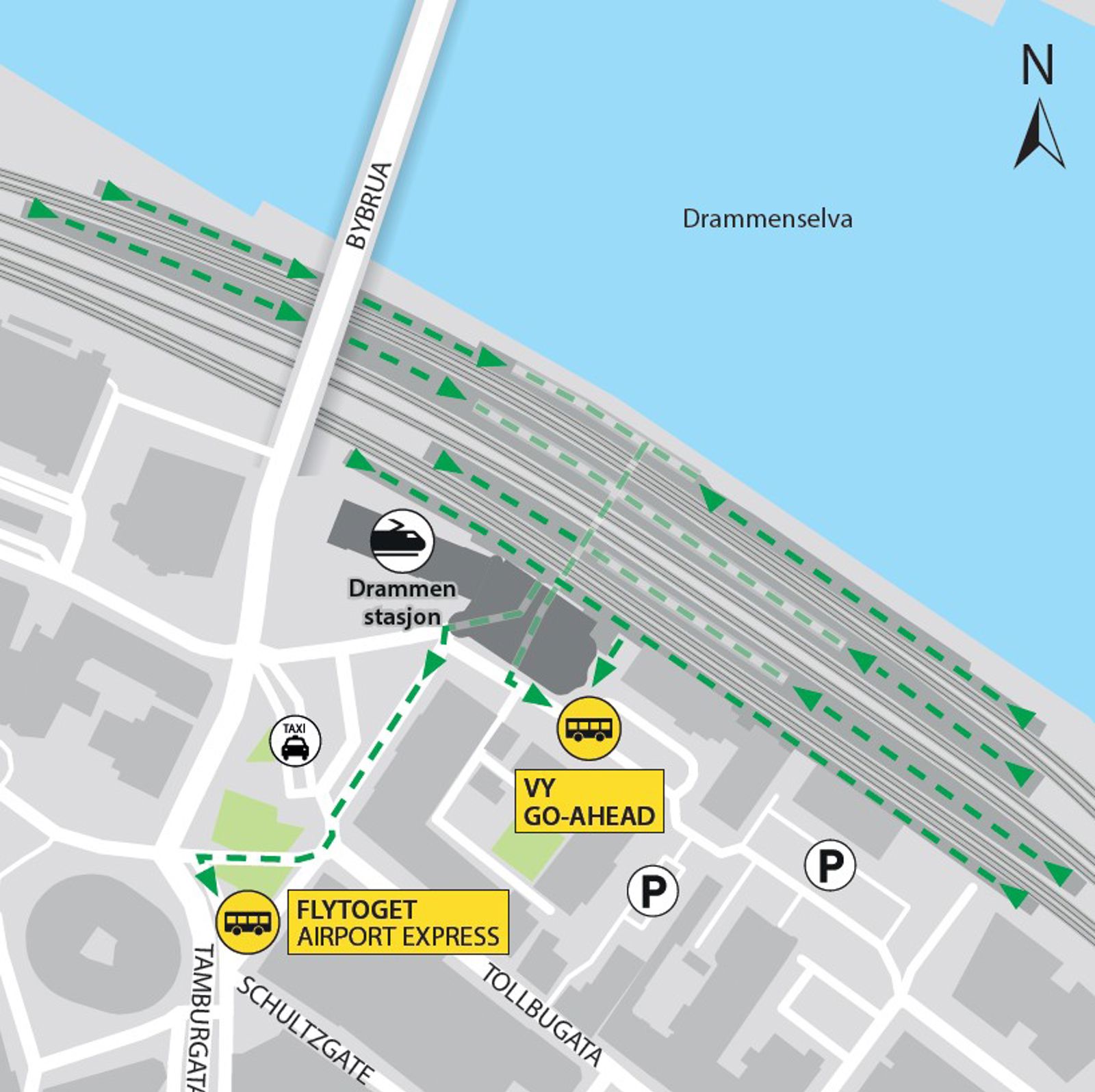 For reisende med Flytoget kjører det busser fra holdeplassen i Tamburgata.
