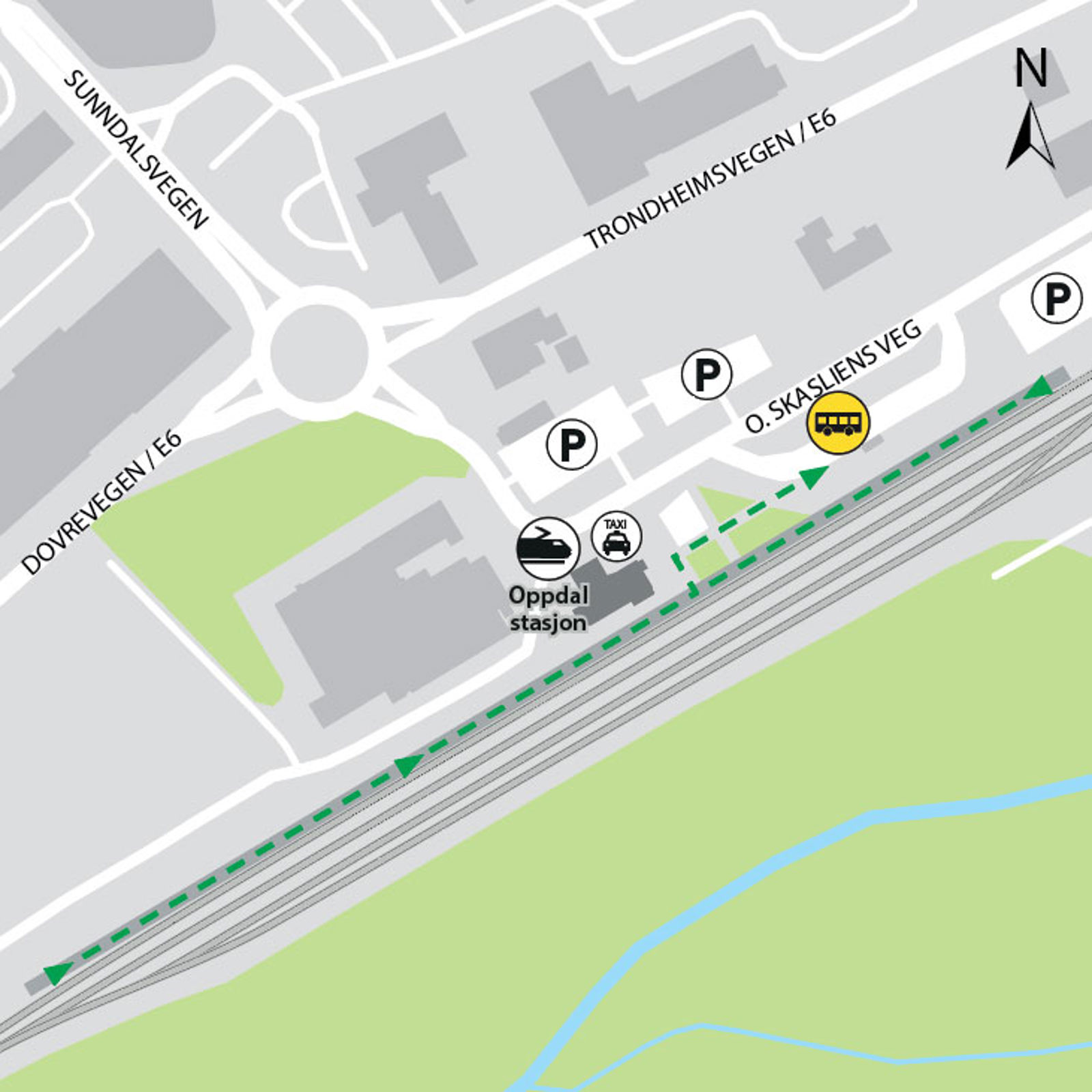 Oppdal stasjon ligger på Dovrebanen. Herfra kan du ta toget i retning Trondheim og Oslo S.